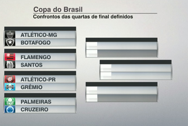 Jogos que prometem muito. O Botafogo eliminou o Atlético em 2007, 2008 e 2013. Cruzeiro e Palmeiras já fizeram algumas das decisões mais lembradas do futebol brasileiro, assim como Flamengo e Santos. Teoricamente o Grêmio foi o único que pegou filet: o Atlético-PR, porém, a teoria nem sempre funciona na prática no futebol.
