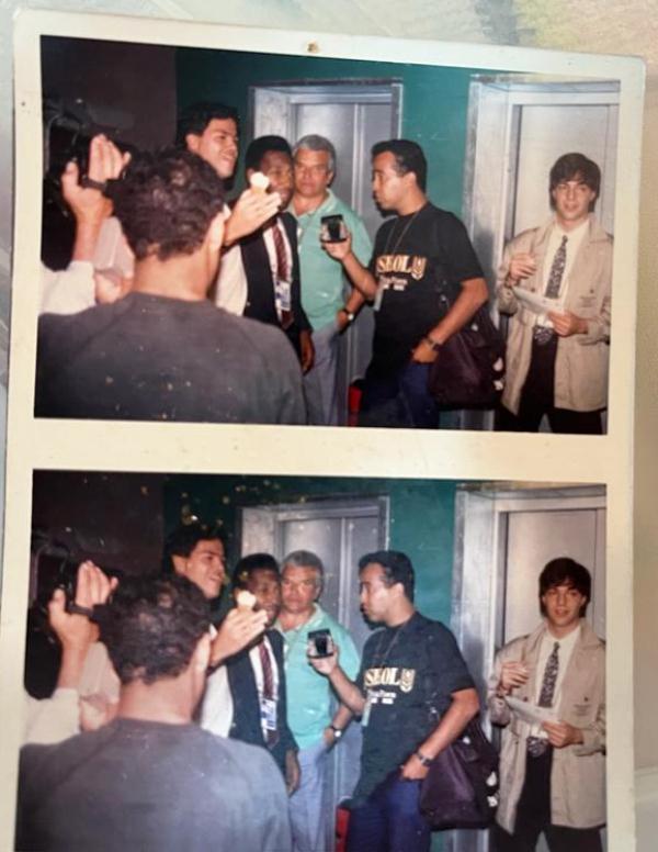 A primeira em 1990, logo após a eliminação do Brasil pela Argentina, nas oitavas de final da Copa da Itália. Foi na porta do elevador do estádio Delli Alpi, em Turim, como mostra esta foto, do alto dessa postagem.